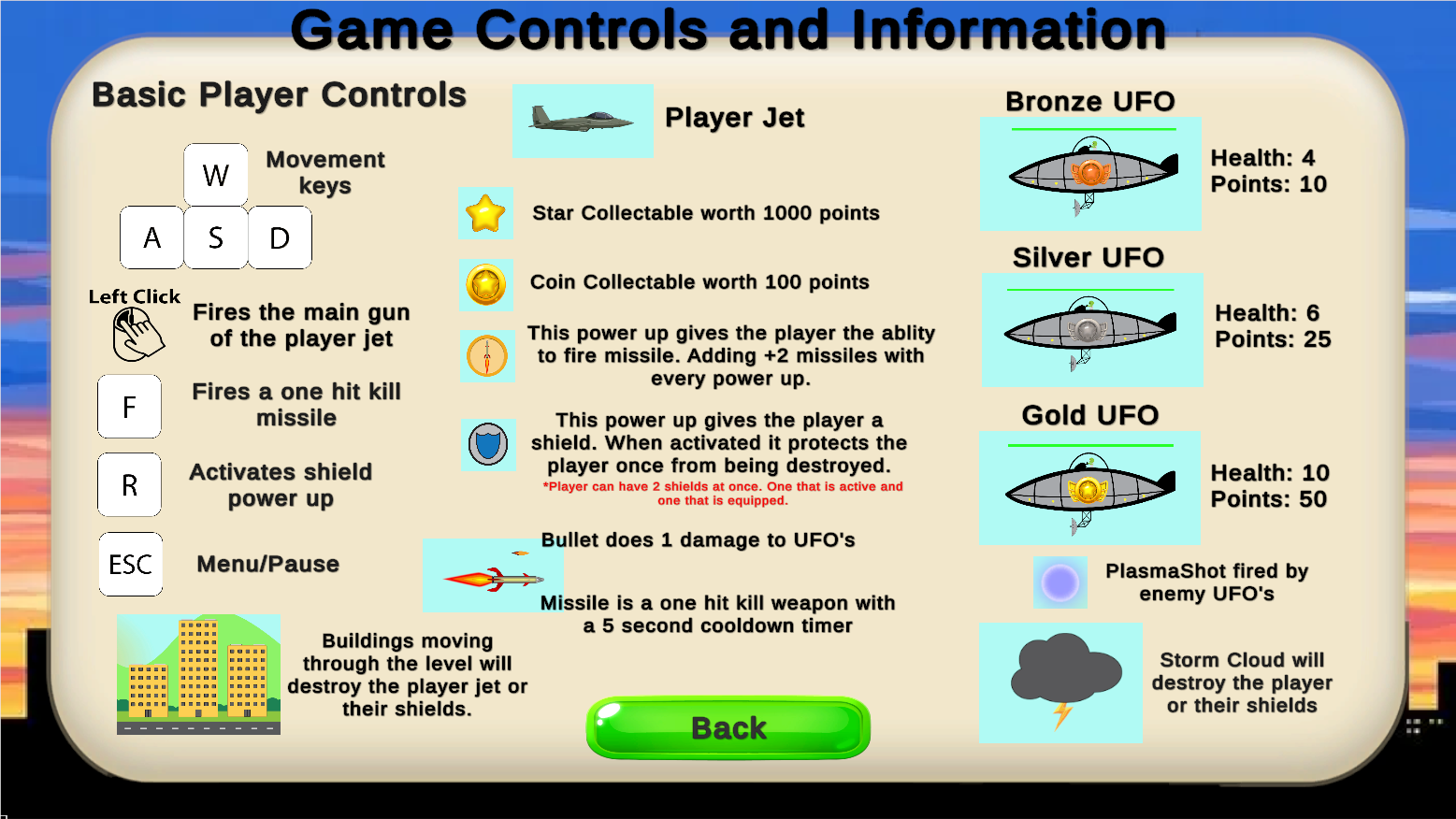Starting out you are thrown into the middle of an alien invasion. With nothing but your fighter jet you must survive as long as you can. Dodging storm clouds and enemy fire while trying to shoot down UFOs. So long as you don’t stay still and keep shooting down UFOs you’ll have a better chance of survival.